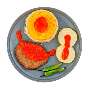 یک سیخ کباب کوبیده 200 گرم گوشت مخلوط گوسفند و گوساله به همراه برنج درجه یک ایرانی همراه با گوجه ، لیمو و....